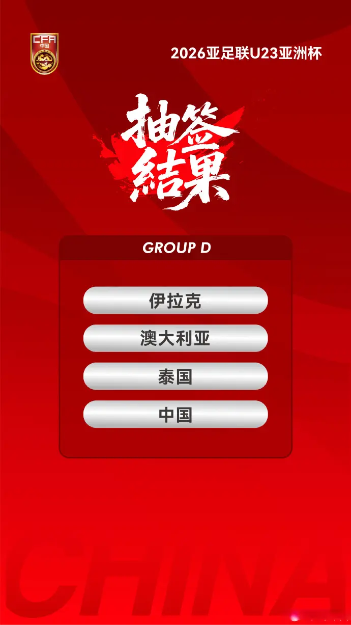 作为第四档球队,U23国足与伊拉克、澳大利亚、泰国同分一组,并且将依次对阵这三支球队。按照规则,小组排名前两位的球队将晋级淘汰赛。